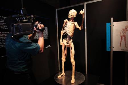 A cameraman films a plastinated human body during a media tour of "The Human Body" exhibition at the convention center in Managua