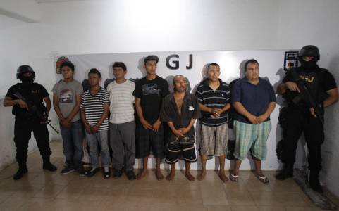 Police officers escort suspects in the killing of six people strangled to death and one decapitated as they are presented to the media during a news conference in Cancun