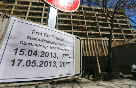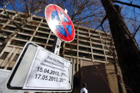 A no parking sign with the exception for media is pictured in front of the Munich court house where the NSU trial is supposed to take place