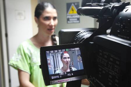 Cuba's best-known dissident, and blogger Yoani Sanchez is interviewed by the media at a local radio station in Lima