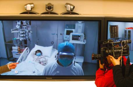 Journalists take pictures of screen showing girl, who according to hospital officials, is infected with new H7N9 bird flu strain, during news conference at Ditan Hospital