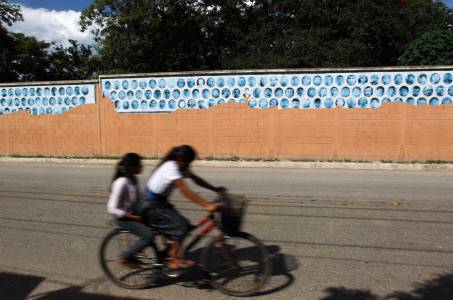 Women ride a bicycle past a wall with pictures of the people who disappeared in the region during the 1960-1996 civil war, in Rabinal, in the Baja Verapaz region, 209 km, (130 miles), of Guatemala City, September 6, 2013. REUTERS/Jorge Dan Lopez (GUATEMALA - Tags: SOCIETY TRANSPORT CONFLICT CIVIL UNREST)