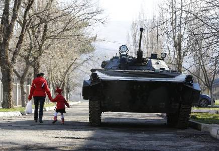 Activists dressed in combat gear and balaclavas said they were giving out red tulips to women as a reminder of the role played by Russian troops