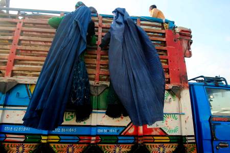 Afghan refugee women, clad in a burqa, climb on a truck to be repatriated to Afghanistan at the UNHCR office on the outskirts of Peshawar