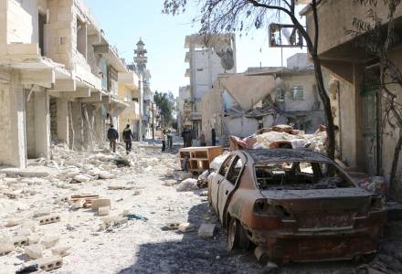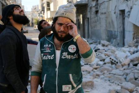 A man stands at a site hit by what activists said was a barrel bomb dropped by forces loyal to Syria's President Assad in Aleppo
