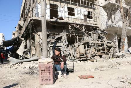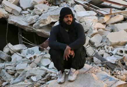 A man sits on the rubble of collapsed buildings at a site hit by what activists said was a barrel bomb dropped by forces loyal to Syria's President Bashar al-Assad in the al-Myassar neighbourhood of Aleppo February 12, 2014. REUTERS/Hosam Katan (SYRIA - Tags: POLITICS CIVIL UNREST CONFLICT MILITARY)