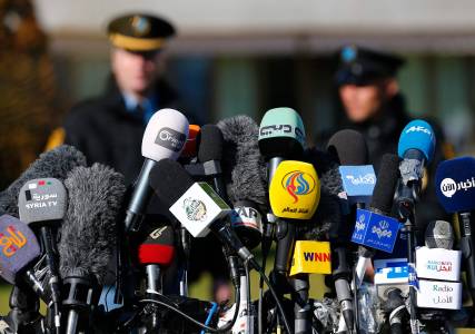 Microphones are pictured before addresses after a meeting at the Geneva Conference on Syria at the United Nations European headquarters in Geneva February 12, 2014. REUTERS/Denis Balibouse (SWITZERLAND - Tags: POLITICS MEDIA)