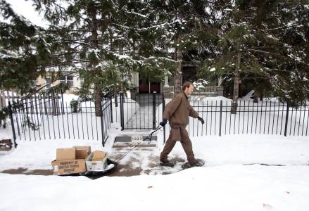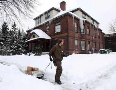 UPS worker looks for address as he pulls sled of packages through snow in Minneapolis