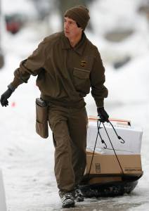 UPS employee pulls a sled of packages through snow in MInneapolis