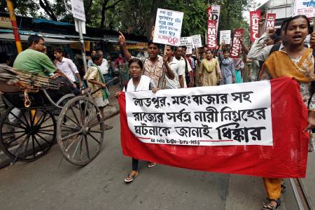 Demonstrators shout slogans as they march through a street during a protest in Kolkata June 2, 2014. Dozens of the demonstrators on Monday marched in the streets of the city to protest the rape of a minor tribal girl by her senior schoolmates on May 29 in Birbhum district in the eastern state of West Bengal, demonstrators said. Banner and a placard read: "We condemn atrocities against women in Labhpur, Mohd. Bazar and other areas of the state" (front), "Police administration explain the rise in rape and murder cases across the state". REUTERS/Rupak De Chowdhuri (INDIA - Tags: CRIME LAW CIVIL UNREST)