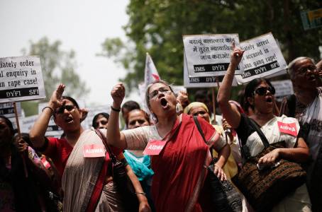 Demonstrators from All India Democratic Women's Association hold placards and shout slogans during protest against recent killings of two teenage girls, in New Delhi