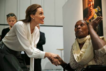 Actress and Special Envoy of the United Nations High Commissioner for Refugees, Angelina Jolie, speaks with Neema Namadamu of the Democratic Republic of Congo at the 'End Sexual Violence in Conflict' summit in London