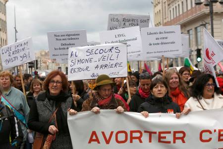 French demonstrators hold a banner to protest against the Spanish government plan to limit abortions that has caused unusually open divisions in the ruling conservative People's Party, in the center of Marseille, February 1, 2014. Protesters from around Spain joined the biggest demonstration so far against a draft bill to restrict abortion to cases of rape or severe danger to the mother's health. Sign (C) reads, "Help, Simone Veil ! Return to the Past". REUTERS/Philippe Laurenson (FRANCE - Tags: HEALTH POLITICS)