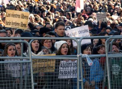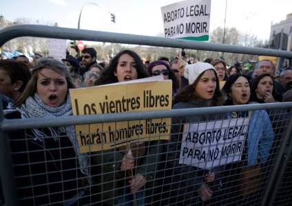 Thousands of people march to protest a government plan to limit abortions in Madrid February 1, 2014. The draft law, announced in December 2013, has prompted dissent within Spain's ruling conservative The People's Party (PP) ranks and protests across the country. It would allow abortion only in the case of rape or if the pregnancy posed a serious physical or mental health risk to the mother. REUTERS/Andrea Comas (SPAIN - Tags: CIVIL UNREST CRIME LAW HEALTH)