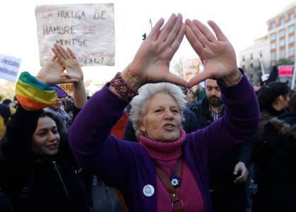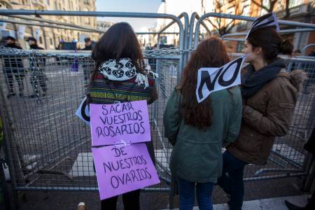 People protest behind a fence near the Spanish parliament against a government plan to limit abortions in Madrid
