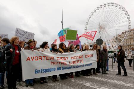 French demonstrators hold a banner to protest against the Spanish government plan to limit abortions in the center of Marseille