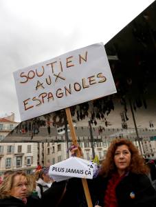 A French woman attends a march to protest against the Spanish government plan to limit abortions that has caused unusually open divisions in the ruling conservative People's Party, in the center of Marseille, February 1, 2014. Protesters from around Spain joined the biggest demonstration so far against a draft bill to restrict abortion to cases of rape or severe danger to the mother's health. Sign reads, "Support for Spanish Women". REUTERS/Philippe Laurenson (FRANCE - Tags: HEALTH POLITICS)