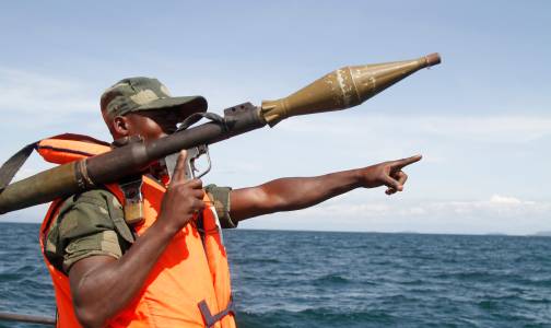Congolese soldier gestures as he patrols the waters of Lake Kivu in search for passengers of a boat that capsized in lake near Goma
