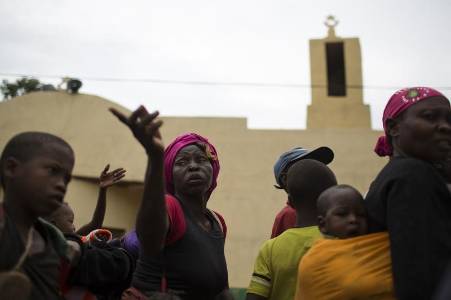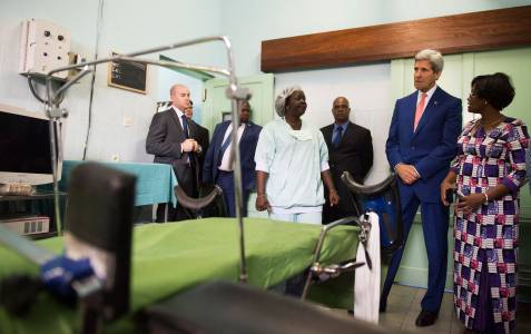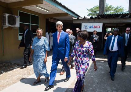 U.S. Secretary of State Kerry walks alongside Hospital Director Nembunzu and Sister Mary Joseph at the Fistula Clinic at Saint Joseph's Hospital, funded by USAID, in Kinshasa