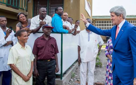 U.S. Secretary of State John Kerry waves to hospital staff after visiting Fistula Clinic at St. Joseph's Hospital, funded by USAID, in Kinshasa