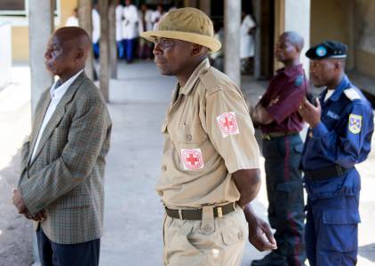 Hospital workers and security watch as U.S. Secretary of State John Kerry tours the Fistula Clinic at Saint Joseph's Hospital, funded by USAID, in Kinshasa
