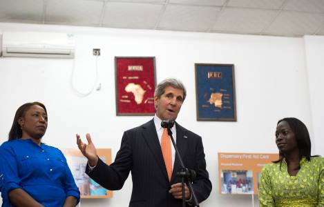 US Secretary of State John Kerry (C) speaks alongside Irene Mpoy (L), director general of Sustainable Investment in Sub-Saharan Africa (SINOCO) and entrepreneur Patricia Nzolantima (R), during a tour at a SINOCO's medical supply store in Kinshasa May 3, 2014. REUTERS/Saul Loeb/Pool (DEMOCRATIC REPUBLIC OF CONGO - Tags: POLITICS HEALTH)
