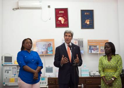US Secretary of State John Kerry (C) speaks alongside Irene Mpoy (L), director general of Sustainable Investment in Sub-Saharan Africa (SINOCO) and entrepreneur Patricia Nzolantima (R), during a tour at a SINOCO's medical supply store in Kinshasa May 3, 2014. REUTERS/Saul Loeb/Pool (DEMOCRATIC REPUBLIC OF CONGOPOLITICS - Tags: POLITICS HEALTH)