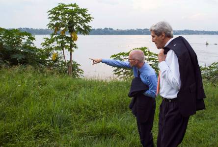 U.S. Secretary of State John Kerry (R) and US ambassador to the Democratic Republic of Congo James Swan, look at the Congo River near the US Chief of Mission Residence in Kinshasa May 3, 2014. REUTERS/Saul Loeb/Pool (DEMOCRATIC REPUBLIC OF CONGO - Tags: POLITICS ENVIRONMENT)