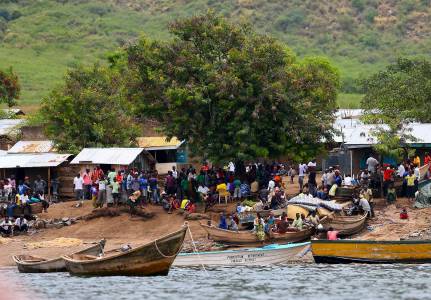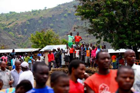 A general view shows the landing site where retrieved bodies are gathered after a boat carrying mostly Congolese refugees capsized at the shores of Lake Albert during rescue operations by the Uganda Marine Unit in Ntoroko southwest of Uganda's capital Kampala, March 23, 2014. According to the Uganda Police rescue team, a total of 25 bodies of mostly children have been retrieved, 45 rescued with hundreds more feared dead. The refugees were returning to DR Congo from Kyangwali refugee resettlement camp after relative peace returning to DR Congo in the recent weeks. REUTERS/Edward Echwalu (UGANDA - Tags: DISASTER)