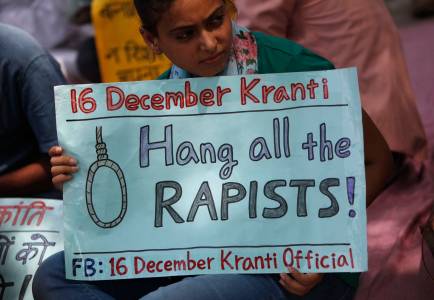 A demonstrator holds a placard during a protest against the verdict of a teenager, who was sentenced to three years in juvenile detention, in New Delhi September 1, 2013. The Indian teenager was sentenced to three years in juvenile detention on Saturday for the December gang rape of a trainee physiotherapist, the first verdict in a case that sparked debate over whether India was too soft on young offenders. REUTERS/Mansi Thapliyal (INDIA - Tags: CRIME LAW CIVIL UNREST)