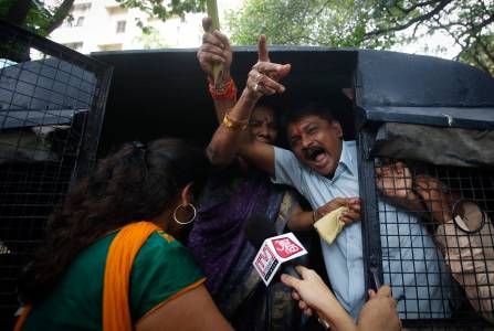 Activists shout slogans from a police van after being detained during a protest in Mumbai