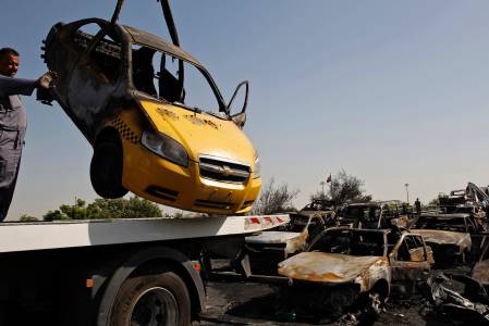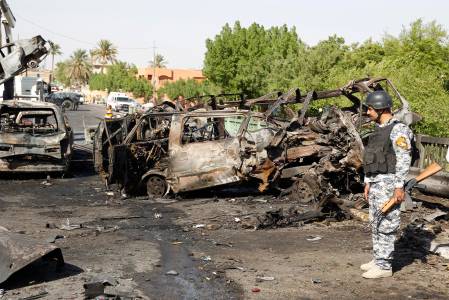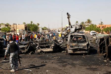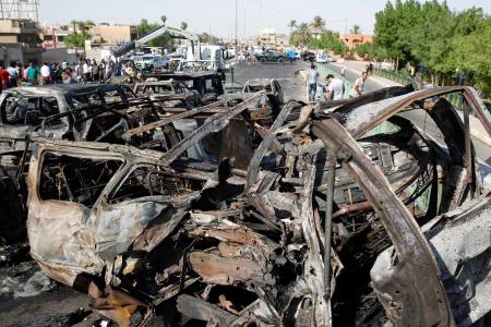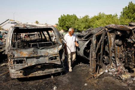 A view shows destroyed vehicles at the site of a triple explosion in a Shi'ite neighbourhood of New Baghdad