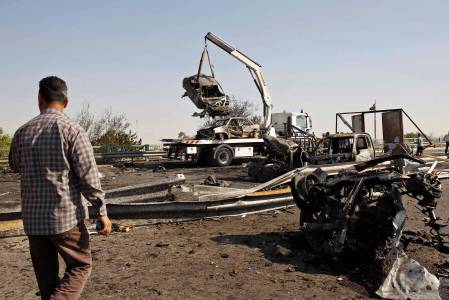 A man watches as the burnt shells of cars are lifted onto a lorry by traffic police clearing the site of a triple explosion in a Shi'ite neighbourhood of New Baghdad