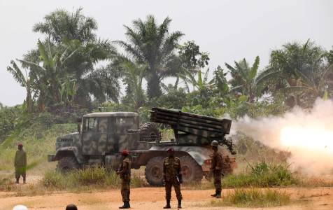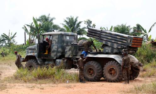 Congolese soldiers launch missiles during their military operation against ADF-NALU rebels outside Beni