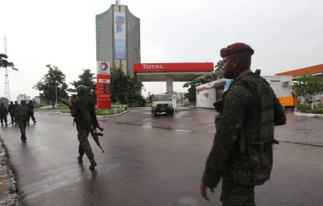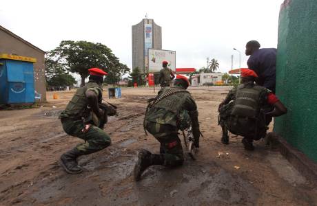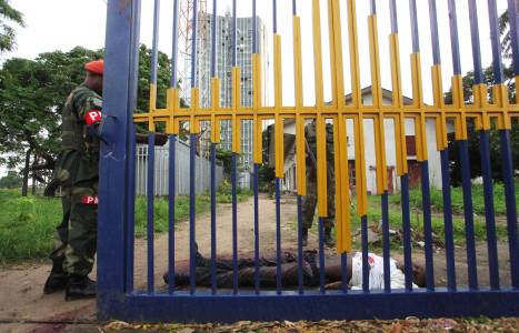 Congolese security forces look at the body of an attacker shot dead outside the state television headquarters in Kinshasa