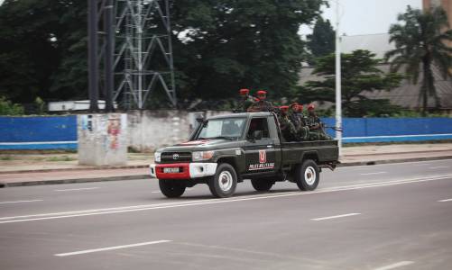 Congolese soldiers ride on their pick-up truck towards the state television headquarters in Kinshasa