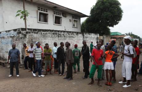 Residents gather to watch as security forces patrol the street near the state television headquarters in the capital Kinshasa, December 30, 2013. Gunmen attacked the airport and seized control of the state television headquarters in the capital of Democratic Republic of Congo on Monday in what appeared to be an attempt to seize power by supporters of religious leader Paul Joseph Mukungubila. REUTERS/Jean Robert N'Kengo (DEMOCRATIC REPUBLIC OF CONGO - Tags: POLITICS CIVIL UNREST CRIME LAW MEDIA)