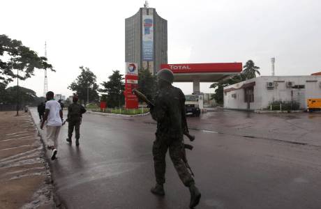 Congolese security forces stand near the body of an attacker shot dead outside the state television headquarters in Kinshasa