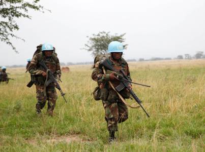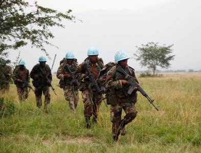 Soldiers from the United Nations intervention brigade exchange information next to a village during a patrol in Virunga National Park