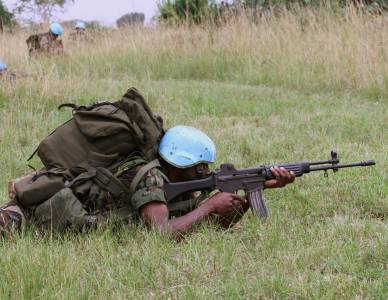 A soldier from the United Nations intervention brigade performs a demonstration during a patrol in Virunga National Park in the Democratic Republic of Congo
