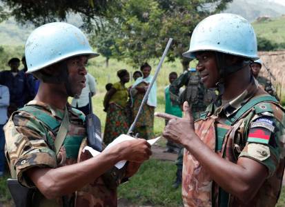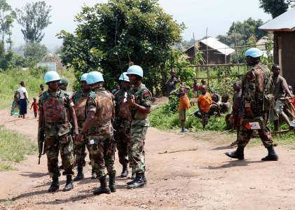 Soldiers from the United Nations intervention brigade exchange information next to a village during a patrol in Virunga National Park in the Democratic Republic of Congo, December 17, 2013. REUTERS/Kenny Katombe (DEMOCRATIC REPUBLIC OF CONGO - Tags: CIVIL UNREST POLITICS MILITARY)