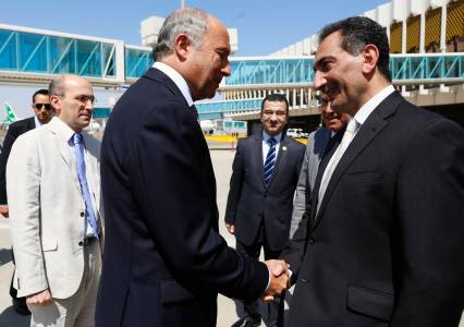 Iraq's Deputy Foreign Minister al-Khairallah welcomes French Foreign Affairs Minister Fabius upon arrival to Baghdad's airport in Baghdad