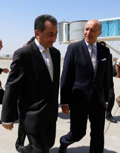 Iraq's Deputy Foreign Minister Nizar al-Khairallah (L) walks with French Foreign Affairs Minister Laurent Fabius upon his arrival to Baghdad's airport in Baghdad, August 10, 2014. Fabius urged Iraq's bickering leaders on Sunday to form an inclusive government capable of countering Islamic State militants advancing through the north of the country. REUTERS/Thaier al-Sudani (IRAQ - Tags: CIVIL UNREST POLITICS CONFLICT)