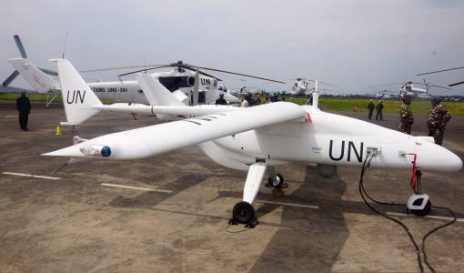A surveillance Unmanned Aerial Vehicles (UAV) drone operated by the United Nations is seen in Goma