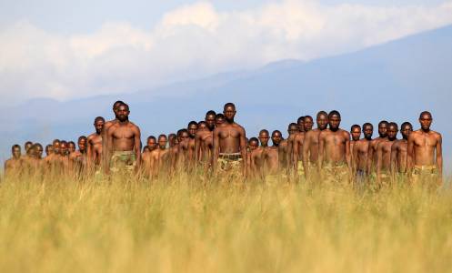 RNPS - PICTURES OF THE YEAR 2013 - M23 rebel recruits stand at attention during a training session at the Rumangabo military camp in eastern Democratic Republic of Congo May 16, 2013. REUTERS/James Akena (DEMOCRATIC REPUBLIC CONGO - Tags: CIVIL UNREST POLITICS MILITARY TPX)