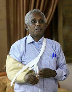 Osman Mirghani, the Editor-in-chief of Al-Tayyar, a daily Sudanese newspaper, rests at his home after being discharged from a hospital, in Khartoum July 23, 2014. Mirghani was assaulted by armed men at the Al-Tayyar office building on Saturday, according to local media reports. Picture taken July 23, 2014. REUTERS/Mohamed Nureldin Abdallah (SUDAN - Tags: MEDIA CRIME LAW)