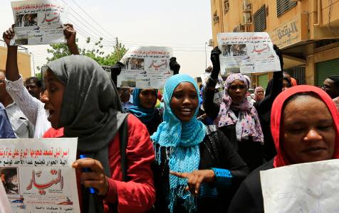 Journalists carry copies of the Al-Tayyar daily Sudanese newspaper as they protest against an attack on its Editor-in-chief Mirghani, in Khartoum