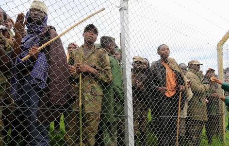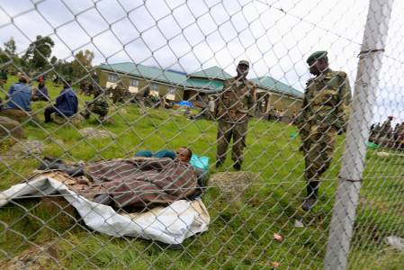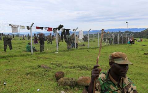 Congolese M23 rebel fighters gather inside an enclosure after surrendering to Uganda's government at Rugwerero village in Kisoro district, 489km (293 miles) west from Uganda capital Kampala November 8, 2013. Uganda is holding the military commander of Congo's defeated M23 rebel movement after he surrendered, a Ugandan officer said on Thursday, as relief at the end of his rebellion was tempered by concerns about other armed groups. REUTERS/JamesAkena (UGANDA - Tags: POLITICS CIVIL UNREST MILITARY)