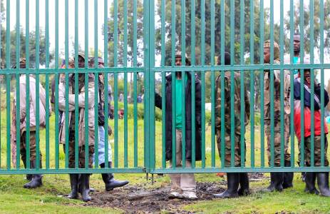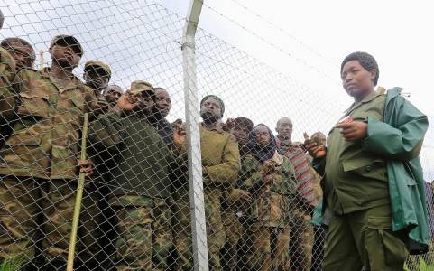 Congolese M23 rebels stand behind a gate where they are being kept after surrendering to Uganda's government at Rugwerero village in Kisoro district