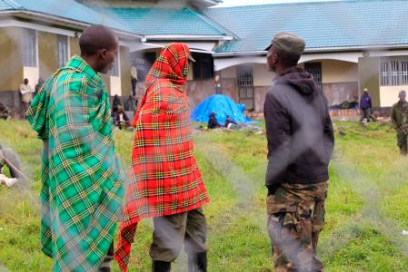 Congolese M23 rebels walk inside an enclosure where they are being kept after surrendering to Uganda's government at Rugwerero village in Kisoro district